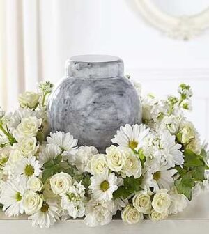 Create a memorial that is thoughtful, touching and beautiful with our Timeless Tribute Cremation Adornment. Perfect for displaying an urn or framed photograph during a service in the center of a ring of florals, this arrangement is crafted with stock, spray roses and more.