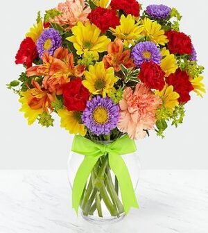 $54.90All the frills and every color under the sun, this fresh flower arrangement is ready to brighten your recipient’s day! Yellow daisies, orange Peruvian Lilies, lavender matsumoto asters, orange carnations, and red mini carnations are accented with bupleuru