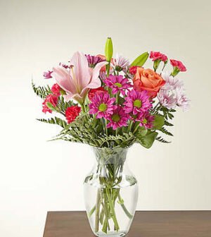 $57.90The Light of My Life Bouquet is a sweet and sophisticated arrangement that is sure to leave a perfect impression. This bouquet features a beautiful blend of pink lilies, orange roses, lavender cushion poms, and hot pink carnations, all nestled among lush