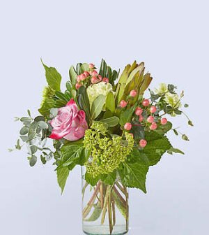 $54.90Elegant and refined, this beautiful bouquet expresses loves every wish with its array of sweet blooms. Pale pink roses, and hot pink spray roses look picture perfect surrounded by white hydrangea, peach hypericum berries, and pink limonium stylishly arran