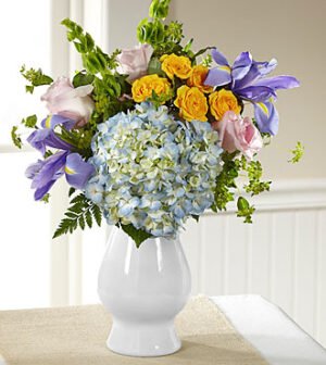 Soft, sweet, and ready to celebrate the new baby with a warm welcome to the world, this fresh flower arrangement blossoms with a fresh-from-the-garden appeal your recipient will adore. Pink roses, yellow spray roses, stalks of green Bells of Ireland, blue