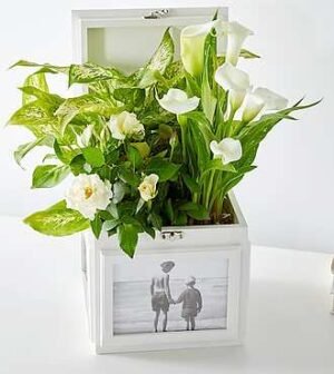 Express warmth to your loved ones with this lovely collection of plants in a Keepsake Box that can be used to hold memories in each photo slot. Planted full of blooms and lush foliage plants, this includes 1 White Calla Lily, 1 White Mini Rose, and 1 Dief