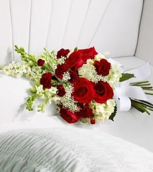 $69.90The Forever in Our Hearts Casket Adornment is a beautiful accent piece that adds that extra touch of elegance to their final farewell service. Red roses and mini carnations are eye-catching and bright arranged amongst white hydrangea, larkspur, snapdragon