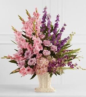 $167.90The Flowing Garden Arrangement bursts with a bounty of blooms to create a stunning tribute of the deceased at their final farewell service. Lavender roses, pink gladiolus, purple dendrobium orchids, purple larkspur and pink hydrangea are accented with an