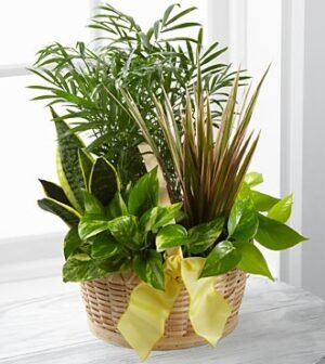 $89.90The French Garden employs lush, green plants to create a gift ideal for any of lifes special occasions. Containing a varied assortment of 6 green plants, this dishgarden arrives presented in a natural round woodchip basket accented with a yellow wired taf