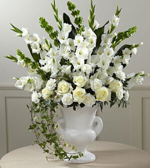 $177.90An expression of sympathy that is tasteful, dignified and with a beautiful sensibility that conveys your feelings with warmth and sincerity. This generously-scaled arrangement makes a superb choice with hand-selected white gladioli, carnations, roses and