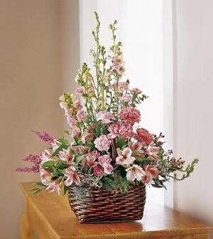 $79.90An array of pink heather, snapdragons, alstroemeria, and larkspur is artfully arranged in a basket. A sweet celebration of life and special memories. Approx. 24H x 22W
