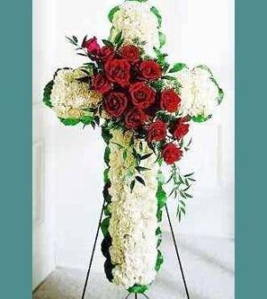 $189.90An appropriate religious display — white carnations and red roses are designed into this religious floral display. Appropriate for the funeral service, this arrangement is delivered and displayed on an easel. Approx. 35h x 22w