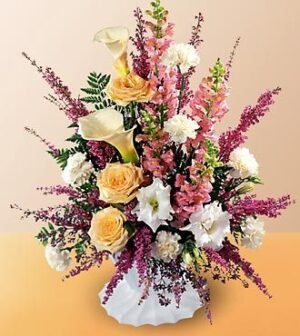 $109.90A soft pastel bouquet to express your best wishes — this arrangement features white calla lilies and yellow roses surrounded by heather, white lisianthus, pink snapdragons and more. Appropriate to send to a residence, funeral home, or memorial service. A