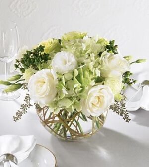 $99.90White and light green roses, gorgeous green hydrangea and green carnations along with white lisianthus accented with seeded eucalyptus and curly willow arranged in a clear glass bubble bowl.