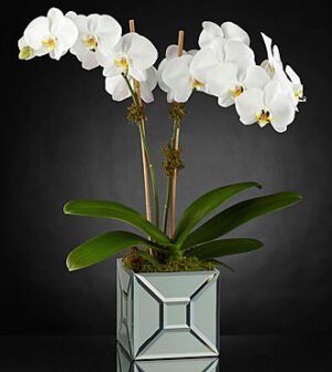 $157.90Few things are as simply elegant as an orchid plant. This gorgeous phalaenopsis orchid makes you take note of its easy beauty, boasting two stems heavy with rows of eye-catching white blooms. Presented in a mirrored cubed container that reflects light at
