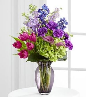 $97.90The Always Remembered Bouquet is a colorful symbol of a life that will never be forgotten. Purple tulips, blue delphinium, lavender mini calla lilies, purple carnations, lavender larkspur and green hydrangea are gorgeously arranged in a clear purple desig