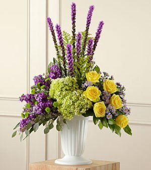 $157.90Contrasting blooms of purple, green and yellow create an original and beautiful expression of sympathy and sorrow, eminently appropriate for celebrating a life that has passed. This stately arrangement handcrafted by a local FTD artisan florist features a