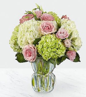 $99.90The play of pink against green and white can’t help to bring a mirthful beauty to this stunning bouquet. The blushing swirl of the roses and lisianthus bring a sweet drama to this arrangement offset by clusters of green and cream hydrangea. With a tinted