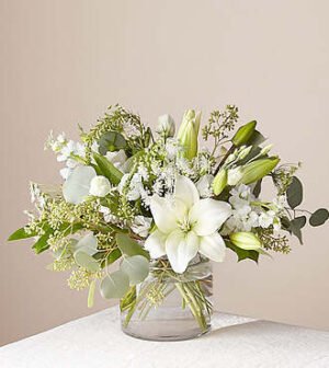 $89.90An illuminating array of florals brings an air of elegance to any room it’s placed. This arrangement features refined florals like lilies, Queen Anne’s Lace and Veronica in a clear glass vase to add a touch of sophisticated style to your special occasions