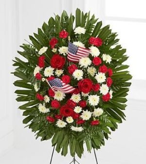 $407.90The FTD To Honor Ones Country Wreath is a vibrant patriotic tribute to a fallen soldier. Red carnations form a gorgeous wreath, accented with blue iris and white Asiatic lilies, which encircles a blue fabric with white stars on it, in character with the A