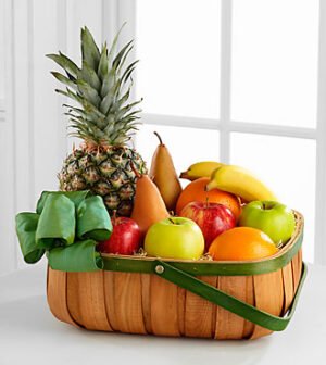 $49.90The FTD Thoughtful Gesture Fruit Basket is a gift that offers warmth and comfort to the family and friends of the deceased. A beautiful green rimmed natural woodchip basket accented with a green taffeta ribbon arrives with a collection of everyones fruit
