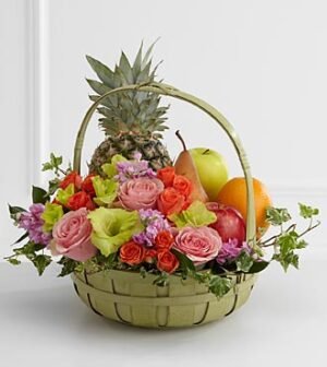 $89.90The FTD Rest in Peace Fruit and Flowers Basket is a thoughtful gift that conveys your warmest sentiments for the family and friends of the deceased. Pink roses, pink stock, orange spray roses, green gladiolus, variegated ivy and lush greens are arranged a