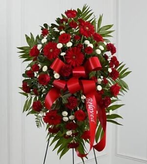 $177.90The Treasured Memories Standing Spray is a rich and colorful way to express your unending love and devotion to the departed. An exceptional arrangement of red roses, burgundy carnations, burgundy mini carnations, red gerbera daisies and white button poms