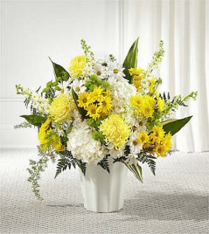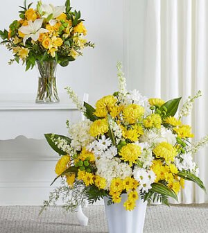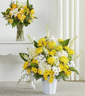 This gloriously golden sympathy set features traditional arrangements meant for celebrating the life of a loved one at a visitation, funeral, church service, cremation, or cemetery service or as a delivery to the home of the family.
