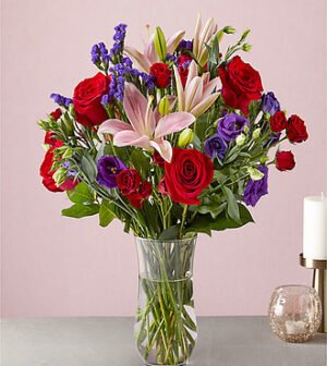$89.90This dreamy jewel toned bouquet combines bold color and eye catching texture to make a statement. Featuring a thoughtful array of both roses and lilies, this dazzling assortment is bound to impress your recipient.