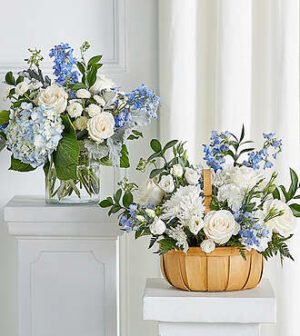 $189.90Featuring soothing tones of blue and white, the traditional arrangements of this sympathy set are meant for celebrating the life of a loved one at a visitation, funeral, church service, cremation, or cemetery service or as a delivery to the family’s h