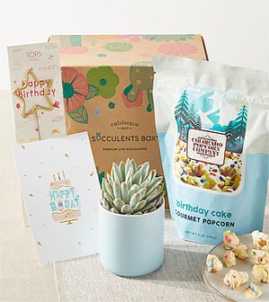 $64.90Celebrate their birthday with a succulent surprise! Show a special person in your life just how much you appreciate them with our Happy Birthday Succulent Gift Box. This easy care succulent, birthday cake popcorn and Happy Birthdya sparkler candle is the