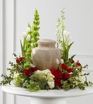 $187.90The Tears of Comfort Arrangement is an elegant and sophisticated way to surround their urn with floral beauty at the final farewell service. Rich red roses and spray roses are vivid and bright amongst white tulips, larkspur, hydrangea and trachelium, acce