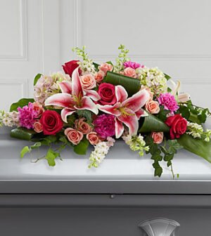 $227.90An extraordinary way to pay your respects to someone very close, this colorful mixed flower casket spray beautifully delivers your sincere expression of love and sympathy. Traditionally ordered by the deceased’s immediate family, this casket enhancement h