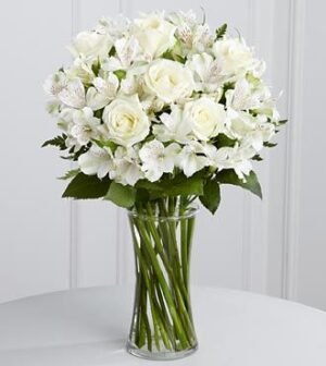 Bright white roses and Peruvian lilies are accented by lush greens and gorgeously arranged in a clear glass gathering vase to create a bouquet that will show how much you care. Approximately 22H x 15W.