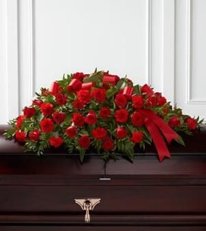 The Dearly Departed Casket Spray bursts with the love and passion that the deceased had for their life and loved ones. Rich red roses and carnations are gorgeously arranged amongst lush greens and accented with a red satin ribbon to create the ideal adorn