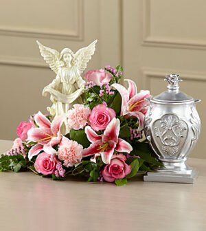This extraordinary mixed flower bouquet delivers your sympathy with a beauty and faith that reflects the love and loss you feel. The asymmetrical bouquet is hand-arranged by a local FTD artisan florist to make a reverent and respectful setting for an urn