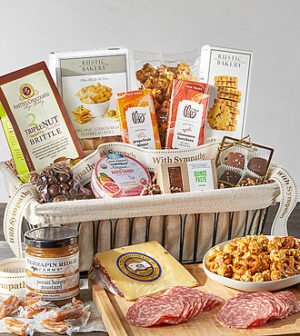 Send caring condolences and healing thoughts with this beautiful gourmet food basket filled heartfelt treats. This deluxe gift basket includes dark chocolate sea salt peanuts, triple nut bourbon brittle, pecan shortbread cookies, and more