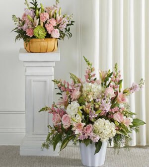 This prim pink set features elegant traditional arrangements fit for all kinds of ceremonies and events.