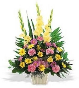 Send an expression of caring with this classic sympathy basket, featuring gladiolus, carnations and mums. Other color schemes are available. Container may vary.