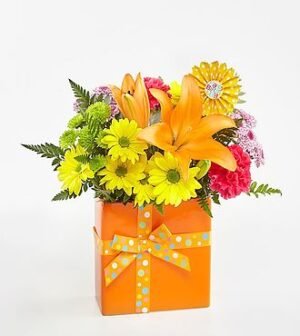 Dazzling and delightful, this bold and colorful flower bouquet is set to impress with its high impact look and graceful styling. Orange roses, hot pink carnations, orange carnations, pale pink gilly flower, hot pink mini carnations, green button poms, and lush greens are beautifully arranged in a raspberry pink glass cubed vase to create a rush of fun and warm wishes to send straight to your recipients door. Ready to celebrate a birthday, extend your congratulations wishes, or to simply say thank you!