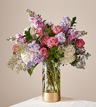 Take a walk in the gardens with this sophisticated bouquet. Composed of an abundance of pastel florals and elegant texture in one of our signature vases, this arrangement brings natural beauty to anywhere it’s placed.