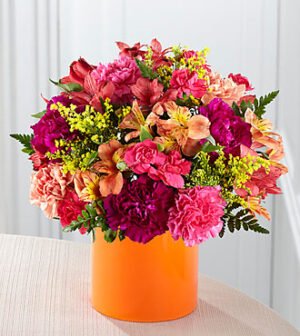 Celebrate their big day with a gift set that brightens up the room. This dazzling arrangement is one of the favorites among our best sellers and comes with a mix of roses, lilies, poms and more. Nestled among the blooms is a Happy Birthday topper to make