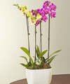 Send a gift of vibrant, yet delicate beauty with our stunning Orchid Garden. This flowering plant arrives in a sleek ceramic white pot with 4 long stems displaying striking purple and yellow orchid blooms.