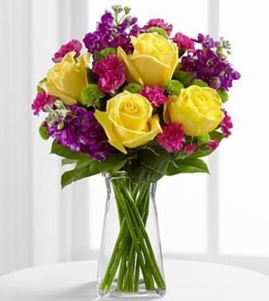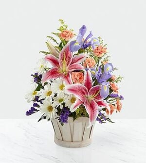 The Wondrous Nature Bouquet is a stunning display of nature’s beauty and color. This bouquet features breathtaking blooms, including Stargazer lilies with their captivating fuchsia petals, blue iris, white traditional daisies, orange mini carnations, and