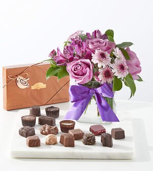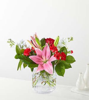 With an abundant blend of roses, carnations, and LA Hybrid lilies in a cinched glass vase, this captivating arrangement is sure to make them feel like they belong on the red carpet.